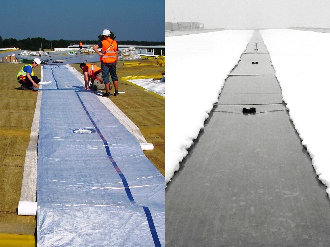 Mata grzewcza AMG została na etapie krycia tego dachu rozłożona w najniższym punkcie koryta spływu do wpustów odprowadzających wodę.