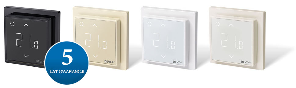 Ponadczasowy, inteligentny i bezprzewodowy DEVIreg Smart Wi-Fi to niewątpliwe oczekiwany na rynku termostat do ogrzewania podłogowego. Intuicyjne menu, prostota obsługi z poziomu smartfona lub tabletu za pomocą aplikacji DEVIsmart App to wielki komfort i wygoda dla użytkownika oraz instalatora. DEVIreg Smart Wi-Fi posiada dotykowy ekran z interaktywnymi przyciskami do ustawiania parametrów sterowania oraz wiele funkcji użytkowych, jak „otwarte okno”, „urlop” czy „ochrona przed zamarzaniem”. Istnieje możliwość montażu Smarta w wieloramkach różnych producentów oraz podłączyć go np.: przy wymianie do innych czujników podłogowych. Ma też możliwość podglądu ilości zużytej energii przez system grzejny oraz dostęp do nastaw termostatu z poziomu interfejsu na stronie internetowej. Ustawienie minimalnej i maksymalnej temperatury pozwala np. ograniczyć temperaturę podłogi przy wykończeniu panelami, podłogą warstwową lub wykładziną. DEVIreg Smart Wi-Fi posiada 5 lat gwarancji i występuje w 4 kolorach: białym, czarnym, kremowym i śnieżno-białym